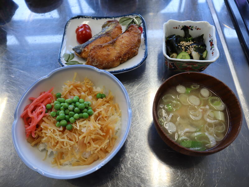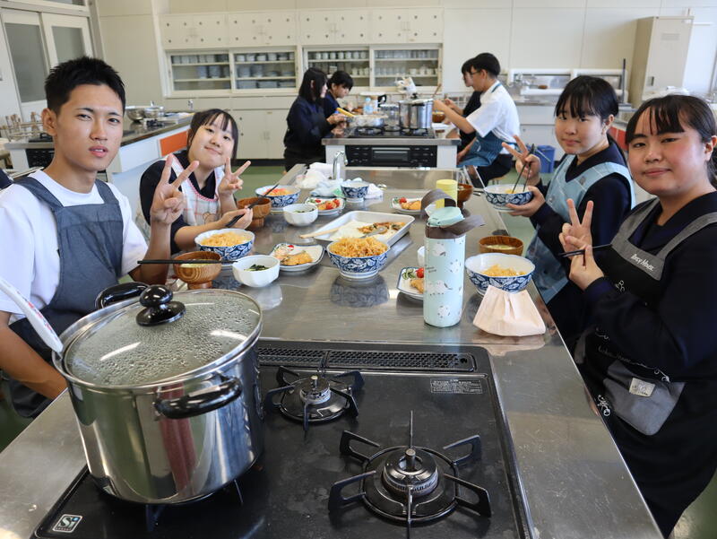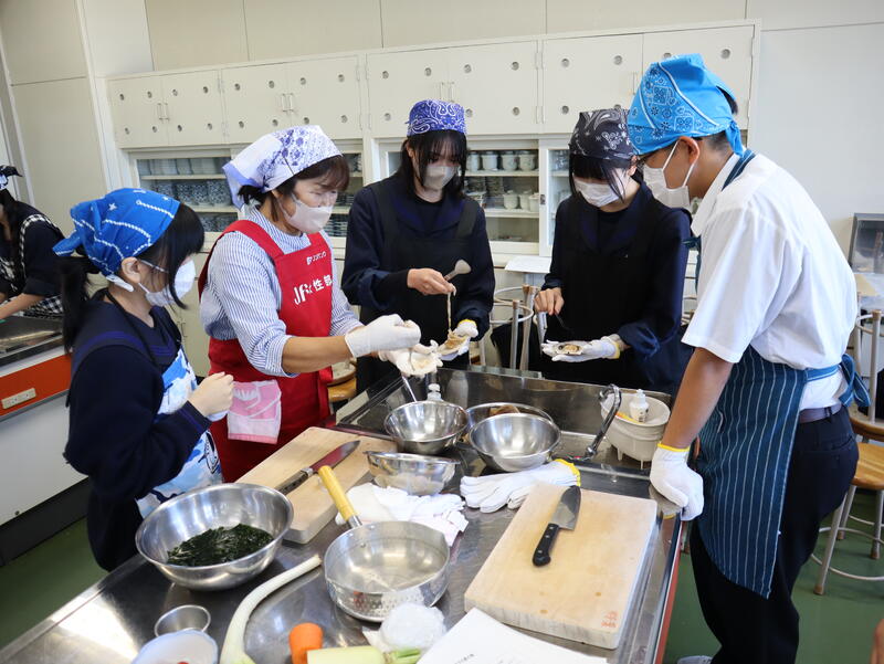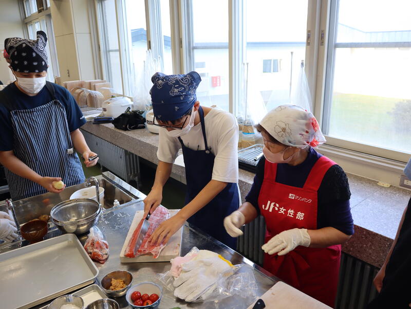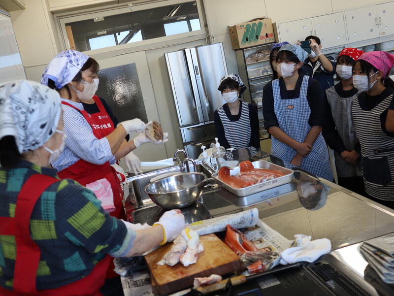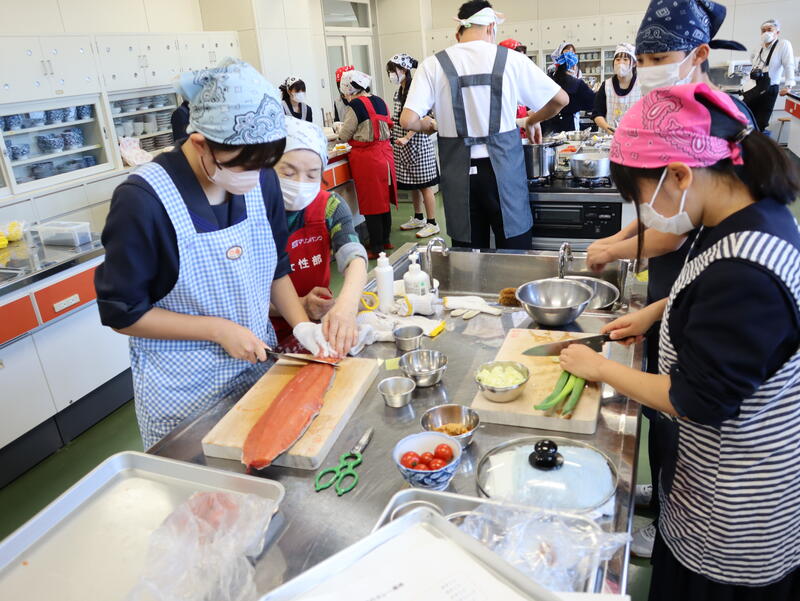 紋別漁業協同組合女性部の皆さんにご協力いただき、地元でとれる魚介類について理解を深め、さばき方や調理法を教わり「ホタテご飯」「鮭のあら汁」「鮭のカレー風味」「ホタテの酢の物」などを作りました。女性部の皆さんに教えていただきながら、ホタテの殻むきをしたり、鮭をさばいたりと皆で協力して調理実習を楽しんでいました。