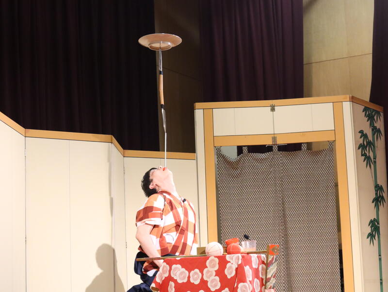 今回は「古典芸能」をテーマに柳家喬太郎さん、古今亭雛菊さんの落語、一龍斎貞橘さんの講談、柳貴家雪之介さん大神楽曲芸を鑑賞しました。出演者の噺(はなし)や芸に魅了され、会場は終始、笑いと拍手に包まれていました。また、途中で生徒が壇上に上がり、落語体験ということで、扇子などの小道具を使った落語における身振りを体験しました。