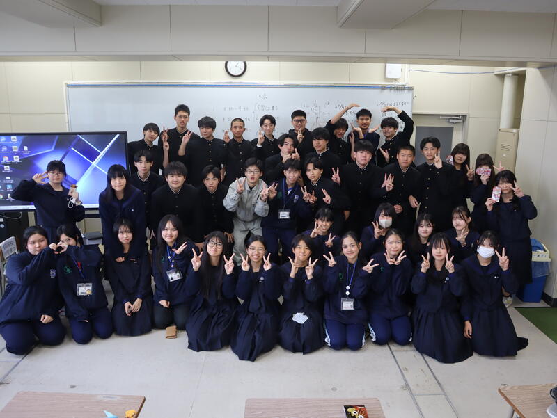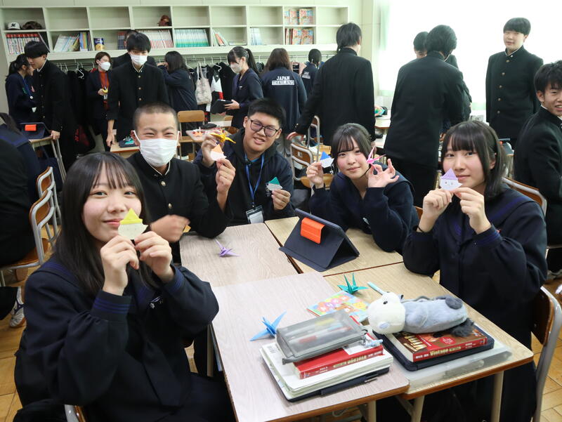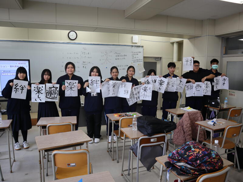 21日(火)から4日間の日程で来校していたタイの留学生も本日で最終日となりました。今日は工業体験に参加し、レーザー加工機を使い、自分たちの名前の入ったオリジナルコースターを作成しました。英語の授業では、2年生の生徒と一緒に、折り紙遊びを体験しました。鶴やカエル、おばけなどいろいろな作品を作って交換するなど、交流を深めていました。最終授業では、書道を体験しました。多くの留学生にとって初めてとなる書道にとまどいながらも、総合ビジネス科の生徒2名と一緒に「楽しい」や「絆」といった漢字を文字通り楽しみながら書いていました。