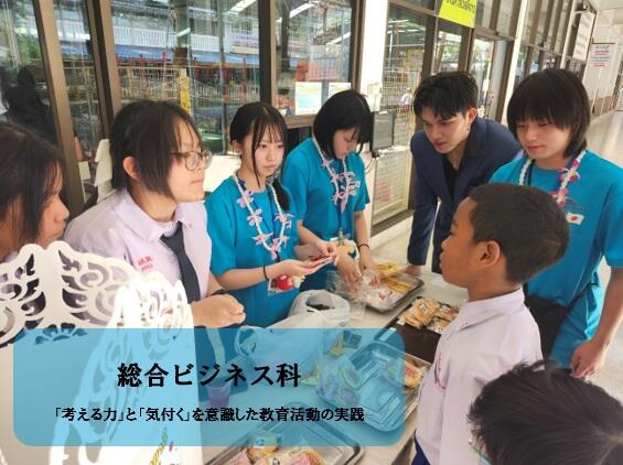 総合ビジネス科では、商業を学ぶ上で必要な「流通ビジネス」「国際経済」「簿記会計」「経営情報」の4つの分野を幅広く専門的に学習する学科です。本校ではさらに(1)地域(2)ビジネス(3)コミュニケーションをキーワードとして「考える力」を意識した授業や行事などの教育活動を展開しています。